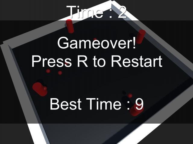 Contrôlez la sphère bleue sur la plate-forme rectangulaire en rotation constante. Les balles volent périodiquement hors des quatre cylindres rouges sur les bords de la scène. Manœuvrez, évitez au maximum les collisions avec eux.